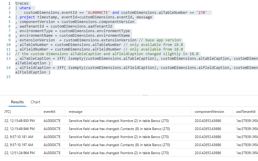 El id del evento es AL0000CTE y esta disponible desde la version 18 de Business Central y el mensaje que devuelve es : «Sensitive field value has changed: {alfieldCaption} ({alFieldNumber}) in table {altableCaption} ({alTableNumber})«.