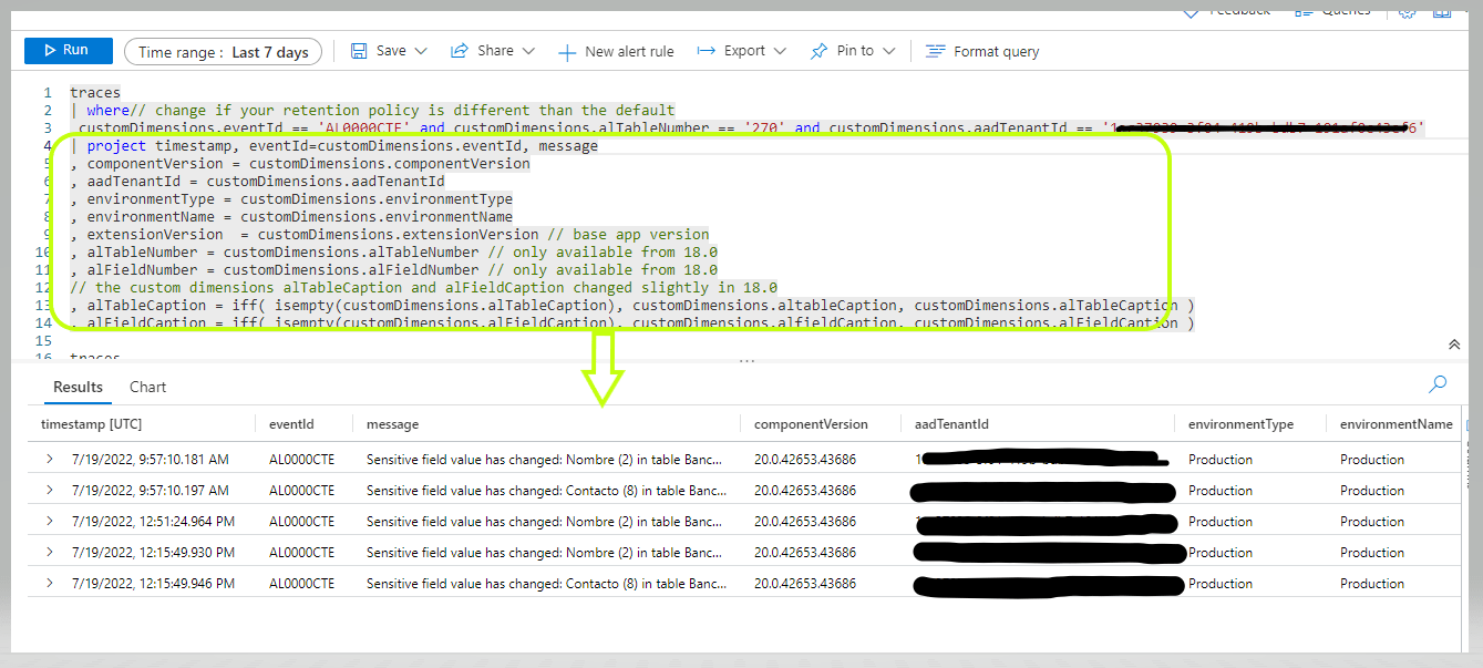 Si ejecutamos la sentencia desde el editor de consultas en Azure Applications Insights y tras haber realizado algunos cambios nos debería devolver algo como esto: