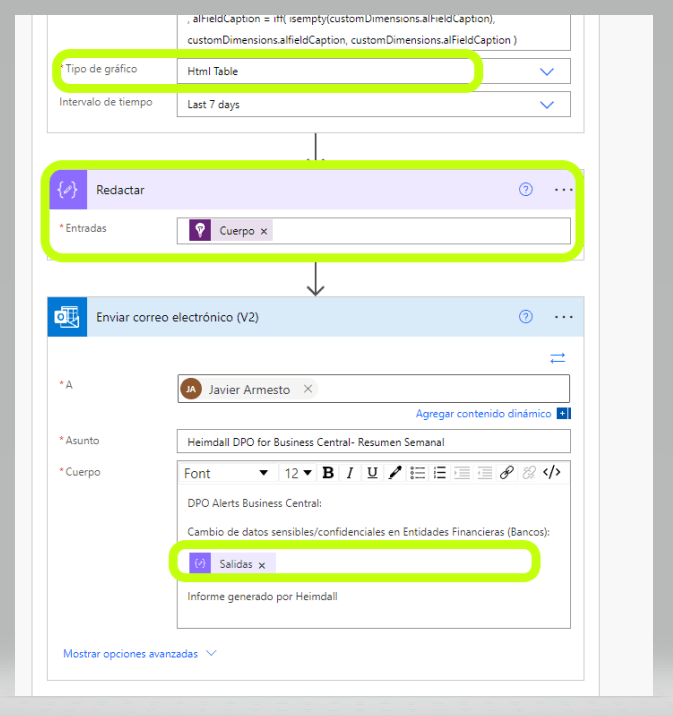 Para poder crear la tabla en el cuerpo de un correo lo que haremos es recoger la salida de la acción de visualizar y procesarla . Así podemos añadir el paso de Enviar correo electrónico de O365 donde en el cuerpo del mensaje podremos componer la comunicación añadiendo la salida del paso Redactar anterior.