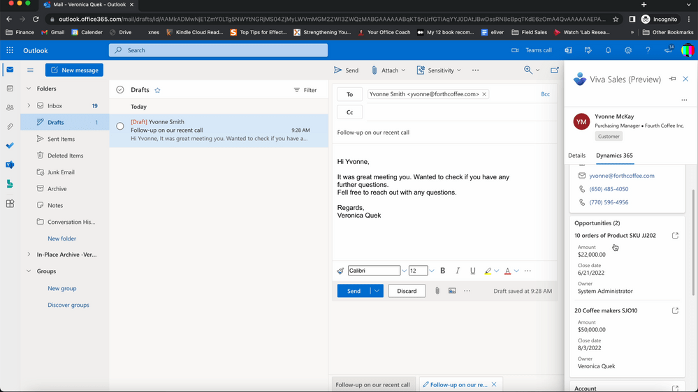 La vista previa de Viva Sales incluye la visualización de la información de contacto del cliente desde nuestro CRM directamente en Microsoft Outlook y Teams, la conexión al CRM de nuestra elección (por favor que sea Dynamics 365 Sales) , la captura de información de contacto enriquecida en Outlook, la captura de notas, actividades y proponer recomendaciones mediante IA.