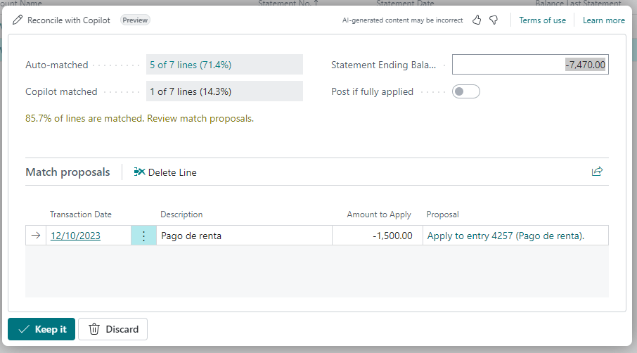 Como comentábamos Business Central realiza tanto el Auto-mach tradicional como por Copilot ,podemos bien navegar en la primeras o bien revisar la segundas en las sección Coincidencias propuestas.