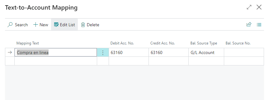 Pulsando Guardar , podemos configurar como Business Central que cuenta propondrá en los sucesivos match relacionados con el texto de la descripción. Como vemos en la siguiente captura: