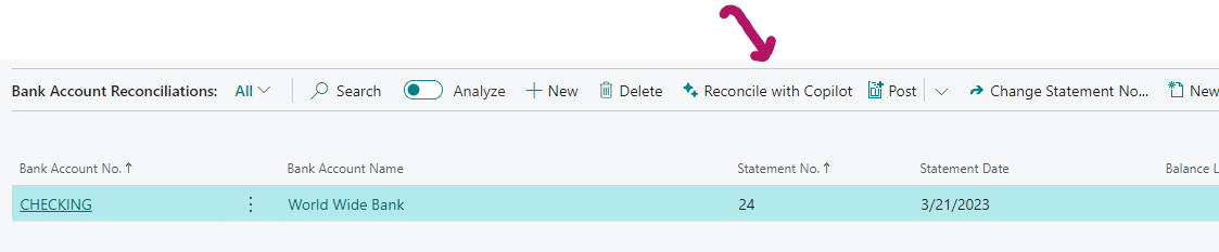 Por ejemplo podemos empezar desde la lista de Conciliaciones Bancarias ( podeis buscar mediante el buscador) , seleccionar una de ellas y pulsar Conciliar con Copilot.