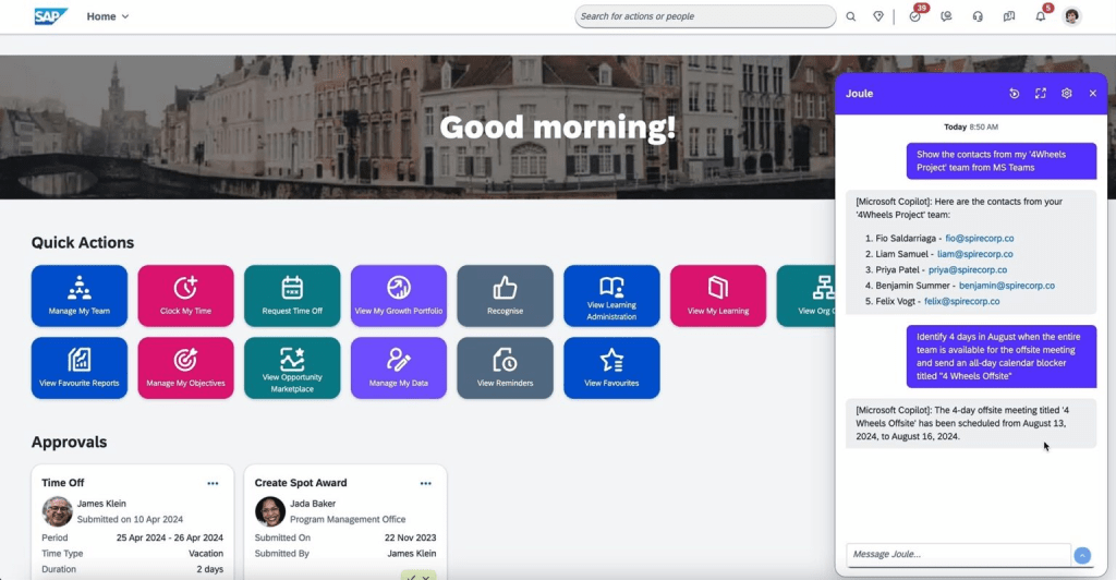 El equipo de producto de Microsoft de Copilot mostro la próxima integración de Joule & Copilot. Es un compromiso de desarrollo a largo plazo entre SAP y Microsoft y van a anunciar algunas otras integraciones Joule & Copilot.