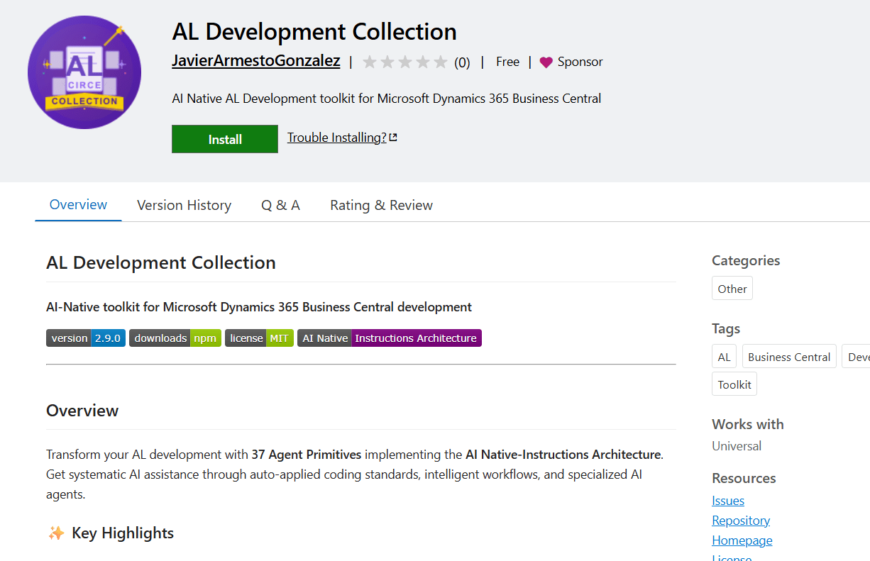 AL Development Collection is now available as an official extension on Visual Studio Marketplace for Visual Studio Code. It is an AI-native toolkit for AL developers working with Dynamics 365 Business Central and GitHub Copilot, designed to turn “playing with AI” into a structured, repeatable development workflow.