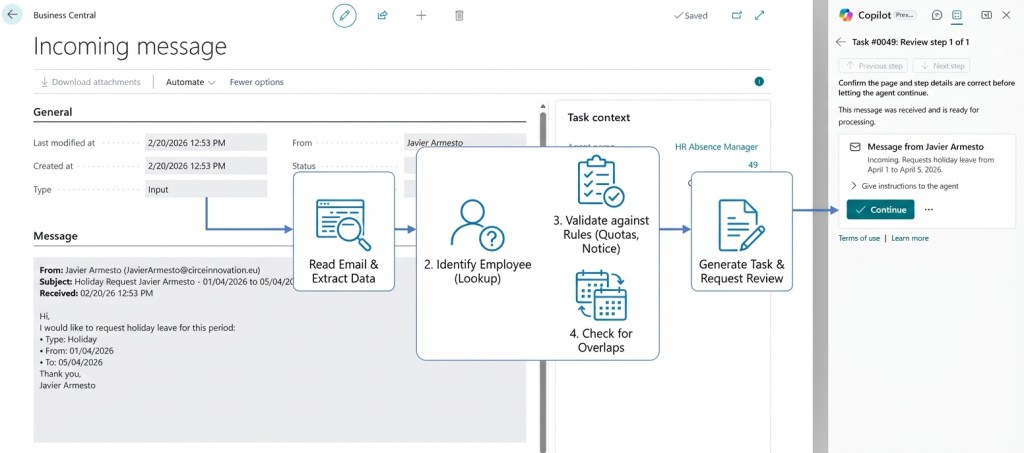 Throughout this article I’ll use a real agent as example: the HR Absence Agent, an agent that monitors a shared mailbox, interprets employee absence requests, evaluates them against company policies, and optionally registers them automatically in Business Central.