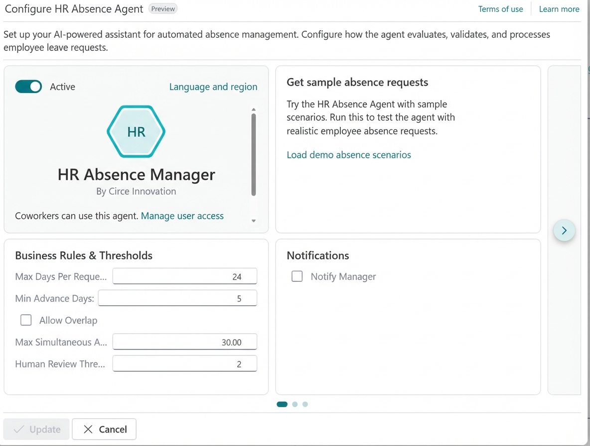 codeunit 51403 "HA Agent Setup"{ Access = Internal; procedure GetInitials(): Text[4] begin exit(AgentInitialsLbl); end; procedure GetSetupPageId(): Integer begin exit(Page::"HA Agent Setup"); end; procedure GetSummaryPageId(): Integer begin exit(Page::"HA Agent KPI"); end; var AgentInitialsLbl: Label 'HR', MaxLength = 4; AgentNameLbl: Label 'HR Absence Agent'; DefaultDisplayNameLbl: Label 'HR Absence Agent'; AgentSummaryLbl: Label 'The HR Absence Agent automatically evaluates incoming employee leave requests against configurable business rules — checking annual quotas, advance notice, overlap policies, and department capacity. It can register approved absences, notify managers, and escalate edge cases for human review. Powered by AI — review its actions for accuracy.';}